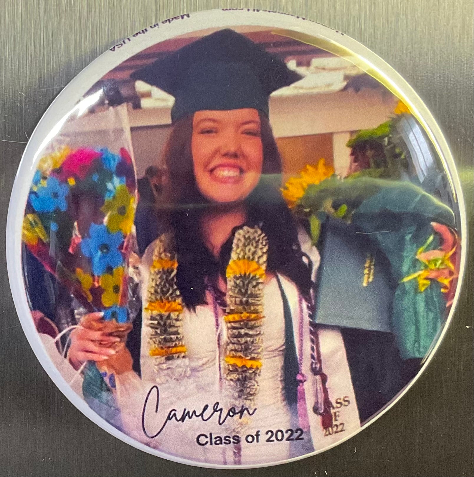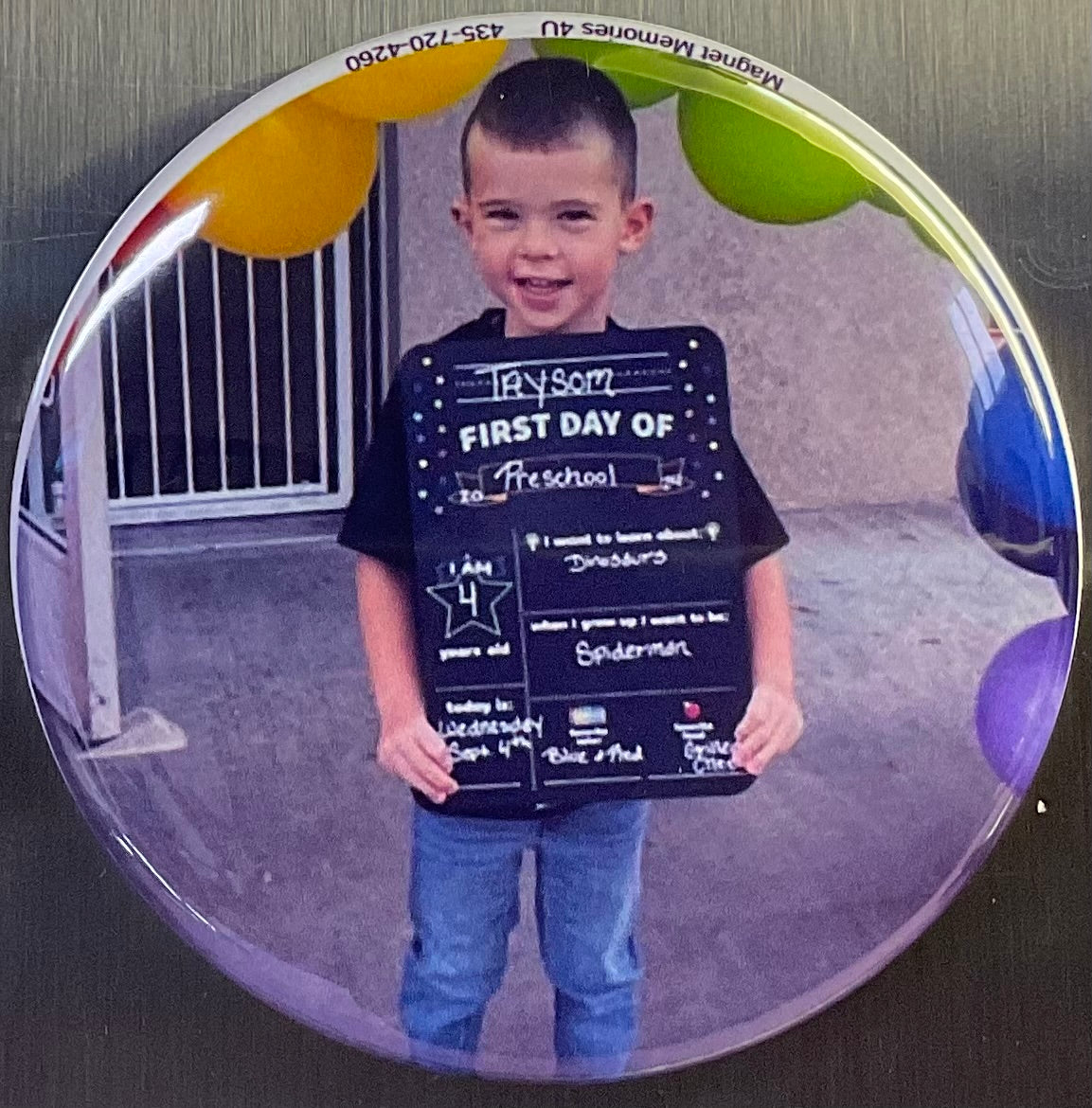 Turn your newborn, first day of school, sports, dance, graduation, vacation pictures and whatever image you want into these adorable magnets. These are 2 1/4 round magnets.